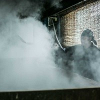 塩竈沖の潮水を神馬藻で濾し、竈でじっくり炊いていきます。丁寧にアクを取りながら10時間以上炊き、火を止めて一晩静かに寝かせると、塩分濃度の高い鹹水(かんすい)となります。このとき、気温や濃度等の条件が揃うと、鹹水中に薄片状の結晶が生じます。結晶の生成は自然にゆだね、この工程には人の手を加えません。
