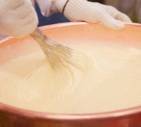 機械まかせには出来ない重要な工程。人間の目で見極めながらクリームを炊き上げます。色や粘度、水分量などを人間の目で見極めながら炊き上げるため、この工程も機械まかせにすることはできません。